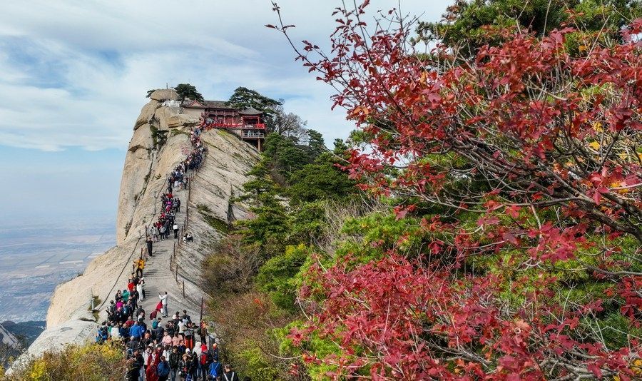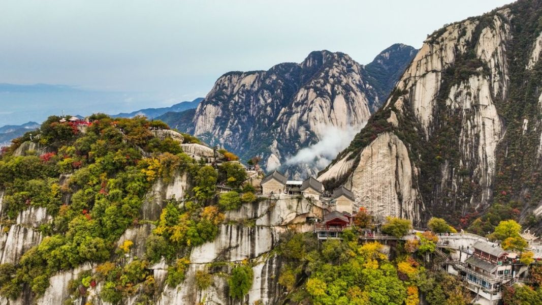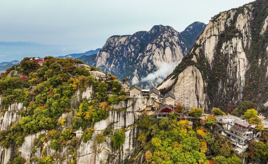 20 octobre 2023 -- Photos aériennes du mont Huashan, dans la province du Shaanxi (nord-ouest de la Chine).