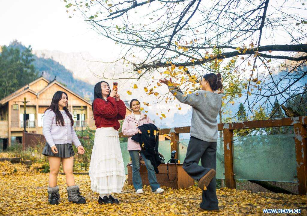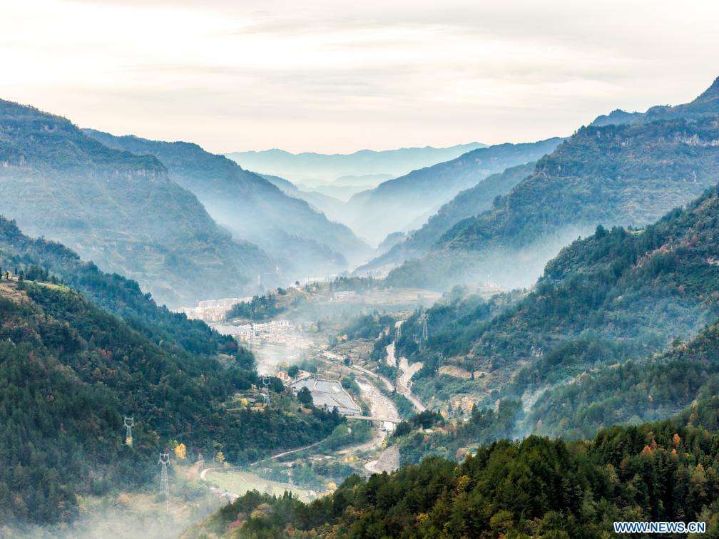 Vue aérienne du bourg de Zhongyi, dans le district de Shizhu, à Chongqing, dans le sud-ouest de la Chine, le 22 novembre 2025.