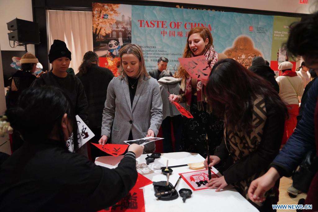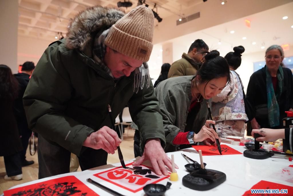 Des personnes découvrent la calligraphie chinoise lors de l'événement culturel Goût de Chine à New York, aux Etats-Unis, le 8 février 2026. Un événement culturel intitulé Goût de Chine a été organisé ici dimanche pour célébrer le Nouvel An chinois.