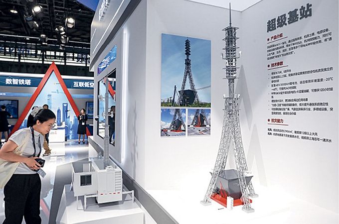 Modèle de « super station de base » (2G, 3G, 4G, 5G, caméra, réseau privé) de China Tower au Congrès mondial de la télécommunication mobile de Shanghai, le 18 juin 2025.