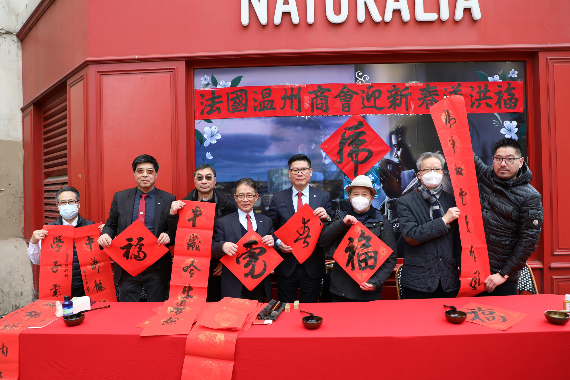 Des calligraphes chinois offrent des vœux de bonheur sur papier rouge dans le 4e arrondissement de Paris.