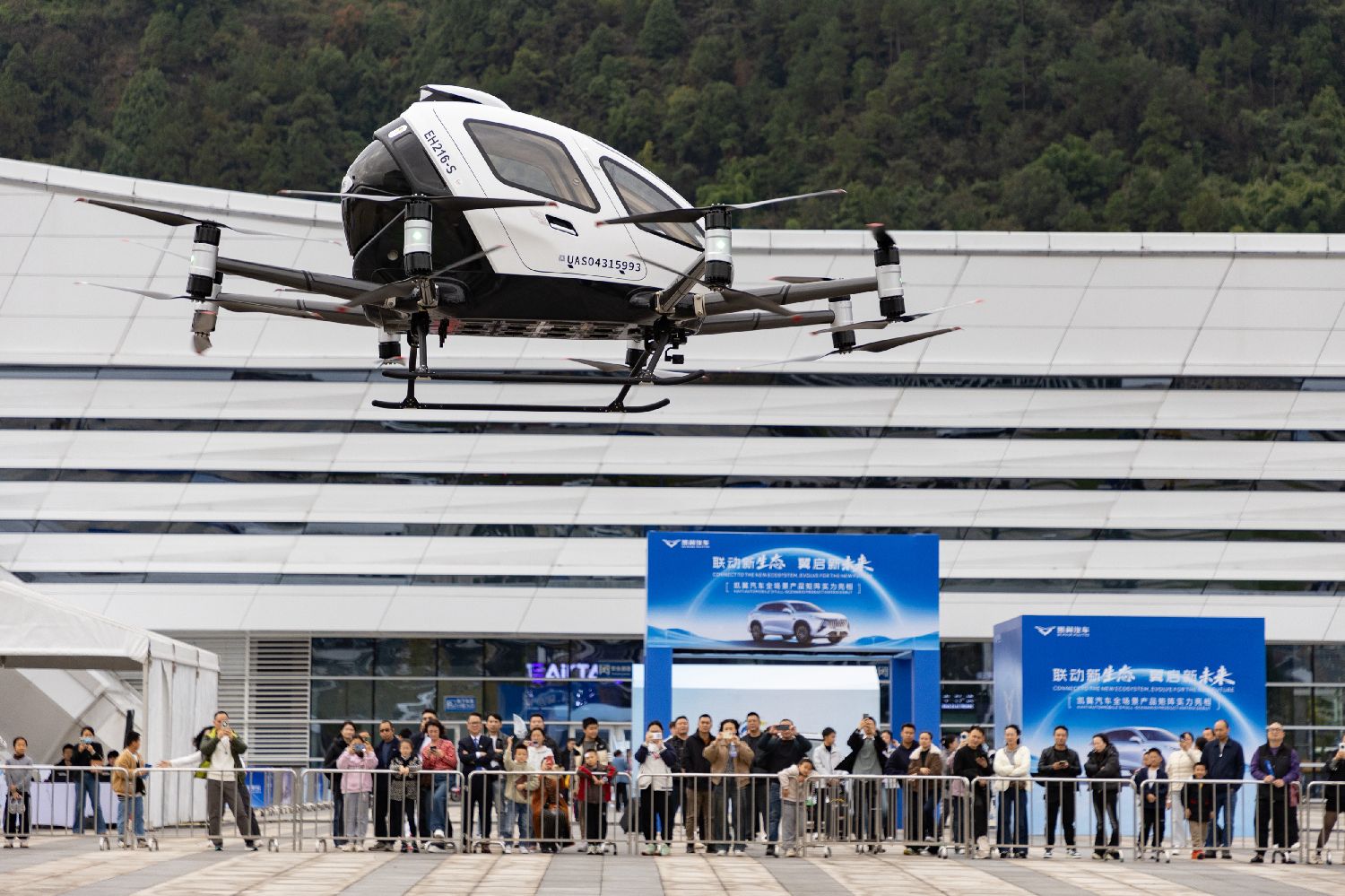 À Yibin (Sichuan), un eVTOL en démonstration lors de la Conférence mondiale 2025 sur les batteries de puissance. © Peng Minxiang/Xinhua