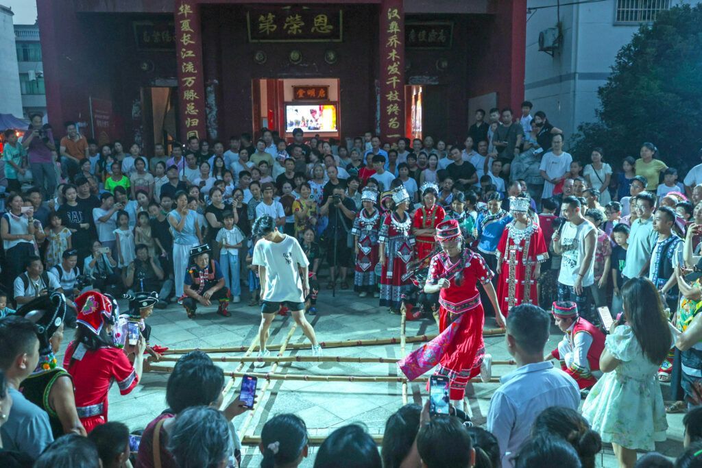 Danse traditionnelle du bambou devant le temple ancestral du Jiangxi