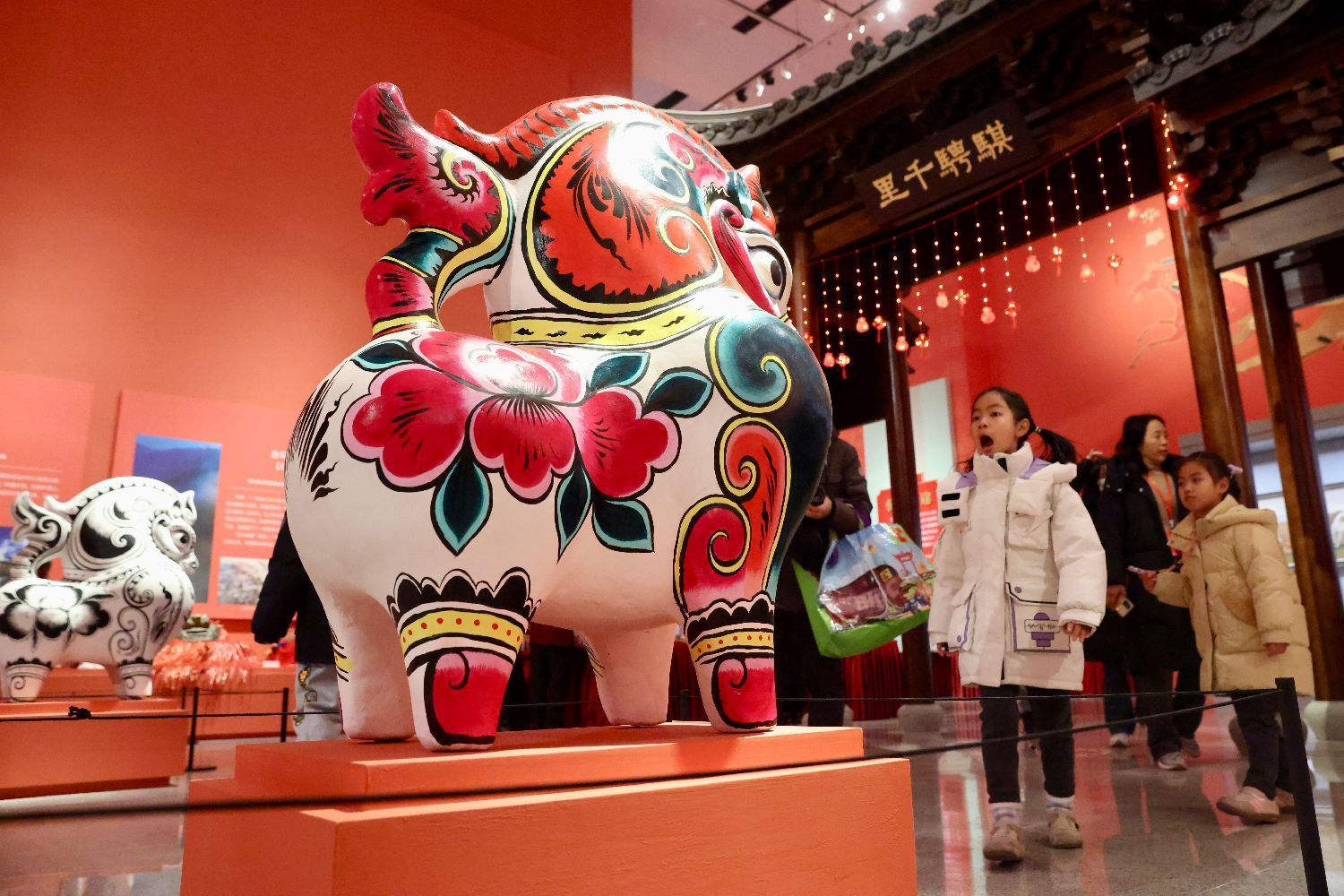 À Pékin, des enfants découvrent la sculpture en argile « Le cheval du général Qin » au Musée du patrimoine culturel immatériel de Chine, dans le cadre des expositions du Nouvel An chinois. © Yi Haifei/CNS