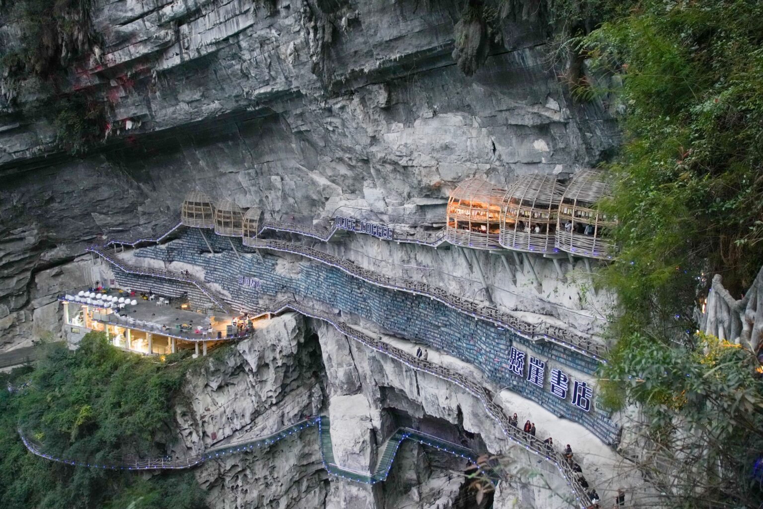 Perchée au bord du gouffre et cernée par une forêt dense, la librairie n’est accessible qu’après une courte randonnée. Sa construction fut un défi extrême : parois karstiques friables, vide abyssal, conditions d’ancrage complexes… Les équipes ont travaillé sur des plateformes temporaires suspendues au-dessus du gouffre. « C’était presque de l’acrobatie en falaise », raconte son fondateur, He Zhijian.